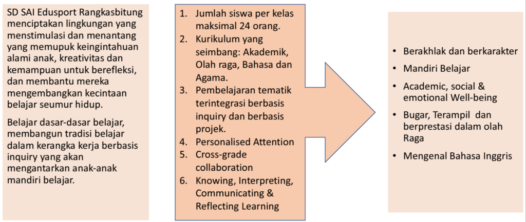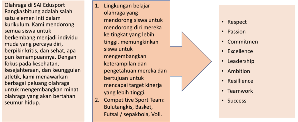SAI-Edusport Rangkasbitung adalah sekolah berbasis Pendidikan sekolah alam yang menjadikan olahraga sebagai elemen inti dalam kurikulumnya, baik intrakurikuler, kokurikuler maupun extra kurikuler. Melalui olahraga kami mendorong semua siswa untuk berkembang menjadi individu yang percaya diri, berfikir kritis, dan sehat, apapun kemampuannya. Dengan fokus pada kesehatan, “kesejahteraan”, dan keunggulan olah raga, kami menawarkan berbagai kegiatanuntuk mengembangkan minat olahraga yang akan bertahan seumur hidup.